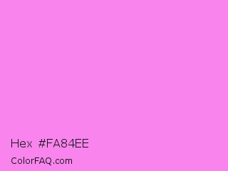 Hex #fa84ee Color is a light magenta color and the nearest color is Light Fuchsia Pink #f984ef. Hex code #fa84ee and RGB value is rgb(250,132,238). In RGB color space, this color is composed of 98% red, 52% green, 93% blue, In CMYK color space, this color is composed of 0% cyan, 47% magenta, 5% yellow , 2% black , In HSL color space, this color has a hue angle of 306° , 92% saturation and 75% lightness.