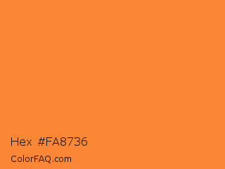 Hex #fa8736 Color is a normal orange color and the nearest color is Crusta #fd7b33. Hex code #fa8736 and RGB value is rgb(250,135,54). In RGB color space, this color is composed of 98% red, 53% green, 21% blue, In CMYK color space, this color is composed of 0% cyan, 46% magenta, 78% yellow , 2% black , In HSL color space, this color has a hue angle of 25° , 95% saturation and 60% lightness.