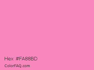 Hex #fa88bd Color is a light rose color and the nearest color is Persian Pink #f77fbe. Hex code #fa88bd and RGB value is rgb(250,136,189). In RGB color space, this color is composed of 98% red, 53% green, 74% blue, In CMYK color space, this color is composed of 0% cyan, 46% magenta, 24% yellow , 2% black , In HSL color space, this color has a hue angle of 332° , 92% saturation and 76% lightness.