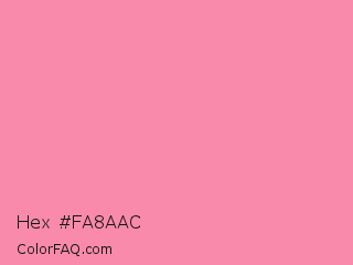 Hex #fa8aac Color is a light rose color and the nearest color is Tickle Me Pink #fc89ac. Hex code #fa8aac and RGB value is rgb(250,138,172). In RGB color space, this color is composed of 98% red, 54% green, 67% blue, In CMYK color space, this color is composed of 0% cyan, 45% magenta, 31% yellow , 2% black , In HSL color space, this color has a hue angle of 342° , 92% saturation and 76% lightness.