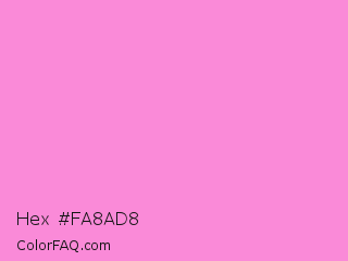 Hex #fa8ad8 Color is a light magenta color and the nearest color is Princess Perfume #ff85cf. Hex code #fa8ad8 and RGB value is rgb(250,138,216). In RGB color space, this color is composed of 98% red, 54% green, 85% blue, In CMYK color space, this color is composed of 0% cyan, 45% magenta, 14% yellow , 2% black , In HSL color space, this color has a hue angle of 318° , 92% saturation and 76% lightness.