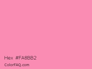 Hex #fa8bb2 Color is a light rose color and the nearest color is Tickle Me Pink #fc89ac. Hex code #fa8bb2 and RGB value is rgb(250,139,178). In RGB color space, this color is composed of 98% red, 55% green, 70% blue, In CMYK color space, this color is composed of 0% cyan, 44% magenta, 29% yellow , 2% black , In HSL color space, this color has a hue angle of 339° , 92% saturation and 76% lightness.