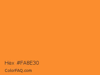 Hex #fa8e30 Color is a normal orange color and the nearest color is Neon Carrot Crayola #ff9933. Hex code #fa8e30 and RGB value is rgb(250,142,48). In RGB color space, this color is composed of 98% red, 56% green, 19% blue, In CMYK color space, this color is composed of 0% cyan, 43% magenta, 81% yellow , 2% black , In HSL color space, this color has a hue angle of 28° , 95% saturation and 58% lightness.