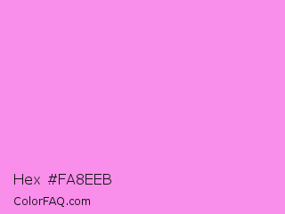 Hex #fa8eeb Color is a light magenta color and the nearest color is Light Fuchsia Pink #f984ef. Hex code #fa8eeb and RGB value is rgb(250,142,235). In RGB color space, this color is composed of 98% red, 56% green, 92% blue, In CMYK color space, this color is composed of 0% cyan, 43% magenta, 6% yellow , 2% black , In HSL color space, this color has a hue angle of 308° , 92% saturation and 77% lightness.