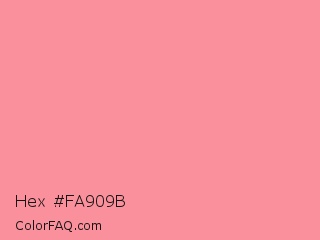 Hex #fa909b Color is a light red color and the nearest color is Pink Salmon #ff91a4. Hex code #fa909b and RGB value is rgb(250,144,155). In RGB color space, this color is composed of 98% red, 56% green, 61% blue, In CMYK color space, this color is composed of 0% cyan, 42% magenta, 38% yellow , 2% black , In HSL color space, this color has a hue angle of 354° , 91% saturation and 77% lightness.