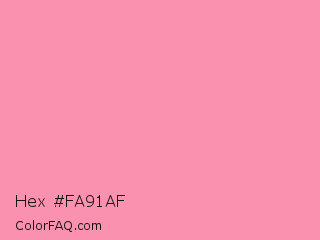 Hex #fa91af Color is a light rose color and the nearest color is Flamingo Pink #fc8eac. Hex code #fa91af and RGB value is rgb(250,145,175). In RGB color space, this color is composed of 98% red, 57% green, 69% blue, In CMYK color space, this color is composed of 0% cyan, 42% magenta, 30% yellow , 2% black , In HSL color space, this color has a hue angle of 343° , 91% saturation and 77% lightness.