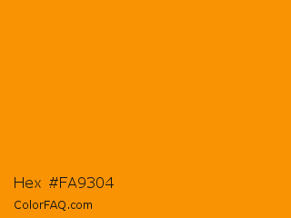 Hex #fa9304 Color is a normal orange color and the nearest color is Orange RYB #fb9902. Hex code #fa9304 and RGB value is rgb(250,147,4). In RGB color space, this color is composed of 98% red, 58% green, 2% blue, In CMYK color space, this color is composed of 0% cyan, 41% magenta, 98% yellow , 2% black , In HSL color space, this color has a hue angle of 35° , 97% saturation and 50% lightness.