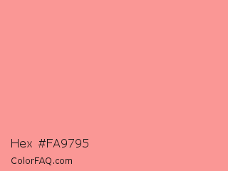 Hex #fa9795 Color is a light red color and the nearest color is Light Salmon Pink #ff9999. Hex code #fa9795 and RGB value is rgb(250,151,149). In RGB color space, this color is composed of 98% red, 59% green, 58% blue, In CMYK color space, this color is composed of 0% cyan, 40% magenta, 40% yellow , 2% black , In HSL color space, this color has a hue angle of 1° , 91% saturation and 78% lightness.