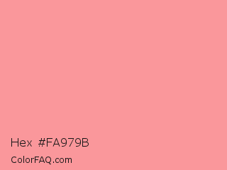 Hex #fa979b Color is a light red color and the nearest color is Light Salmon Pink #ff9999. Hex code #fa979b and RGB value is rgb(250,151,155). In RGB color space, this color is composed of 98% red, 59% green, 61% blue, In CMYK color space, this color is composed of 0% cyan, 40% magenta, 38% yellow , 2% black , In HSL color space, this color has a hue angle of 358° , 91% saturation and 79% lightness.