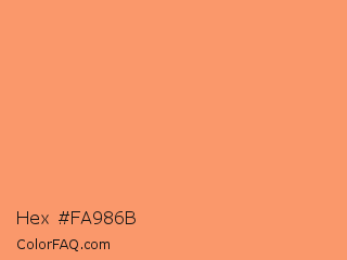 Hex #fa986b Color is a light orange color and the nearest color is Atomic Tangerine #ff9966. Hex code #fa986b and RGB value is rgb(250,152,107). In RGB color space, this color is composed of 98% red, 60% green, 42% blue, In CMYK color space, this color is composed of 0% cyan, 39% magenta, 57% yellow , 2% black , In HSL color space, this color has a hue angle of 19° , 93% saturation and 70% lightness.