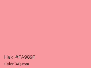 Hex #fa989f Color is a light red color and the nearest color is Light Salmon Pink #ff9999. Hex code #fa989f and RGB value is rgb(250,152,159). In RGB color space, this color is composed of 98% red, 60% green, 62% blue, In CMYK color space, this color is composed of 0% cyan, 39% magenta, 36% yellow , 2% black , In HSL color space, this color has a hue angle of 356° , 91% saturation and 79% lightness.
