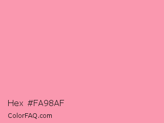 Hex #fa98af Color is a light red color and the nearest color is Schauss Pink #ff91af. Hex code #fa98af and RGB value is rgb(250,152,175). In RGB color space, this color is composed of 98% red, 60% green, 69% blue, In CMYK color space, this color is composed of 0% cyan, 39% magenta, 30% yellow , 2% black , In HSL color space, this color has a hue angle of 346° , 91% saturation and 79% lightness.