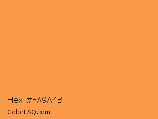 Hex #fa9a4b Color is a light orange color and the nearest color is Neon Carrot #ffa343. Hex code #fa9a4b and RGB value is rgb(250,154,75). In RGB color space, this color is composed of 98% red, 60% green, 29% blue, In CMYK color space, this color is composed of 0% cyan, 38% magenta, 70% yellow , 2% black , In HSL color space, this color has a hue angle of 27° , 95% saturation and 64% lightness.