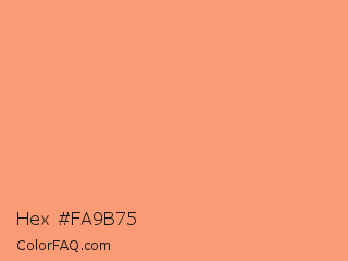 Hex #fa9b75 Color is a light orange color and the nearest color is Light Salmon #ffa07a. Hex code #fa9b75 and RGB value is rgb(250,155,117). In RGB color space, this color is composed of 98% red, 61% green, 46% blue, In CMYK color space, this color is composed of 0% cyan, 38% magenta, 53% yellow , 2% black , In HSL color space, this color has a hue angle of 17° , 93% saturation and 72% lightness.