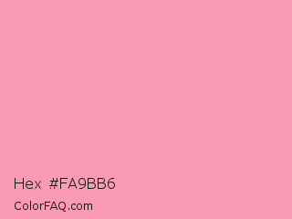 Hex #fa9bb6 Color is a light rose color and the nearest color is Amaranth Pink #f19cbb. Hex code #fa9bb6 and RGB value is rgb(250,155,182). In RGB color space, this color is composed of 98% red, 61% green, 71% blue, In CMYK color space, this color is composed of 0% cyan, 38% magenta, 27% yellow , 2% black , In HSL color space, this color has a hue angle of 343° , 90% saturation and 79% lightness.