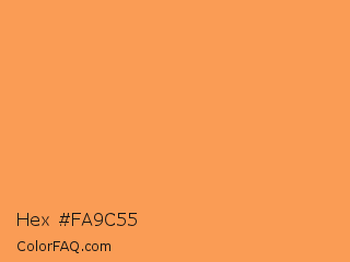 Hex #fa9c55 Color is a light orange color and the nearest color is Tan Hide #fa9d5a. Hex code #fa9c55 and RGB value is rgb(250,156,85). In RGB color space, this color is composed of 98% red, 61% green, 33% blue, In CMYK color space, this color is composed of 0% cyan, 38% magenta, 66% yellow , 2% black , In HSL color space, this color has a hue angle of 26° , 94% saturation and 66% lightness.