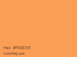 Hex #fa9d55 Color is a light orange color and the nearest color is Tan Hide #fa9d5a. Hex code #fa9d55 and RGB value is rgb(250,157,85). In RGB color space, this color is composed of 98% red, 62% green, 33% blue, In CMYK color space, this color is composed of 0% cyan, 37% magenta, 66% yellow , 2% black , In HSL color space, this color has a hue angle of 26° , 94% saturation and 66% lightness.