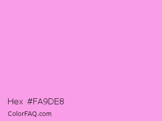Hex #fa9de8 Color is a light magenta color and the nearest color is Lavender Rose #fba0e3. Hex code #fa9de8 and RGB value is rgb(250,157,232). In RGB color space, this color is composed of 98% red, 62% green, 91% blue, In CMYK color space, this color is composed of 0% cyan, 37% magenta, 7% yellow , 2% black , In HSL color space, this color has a hue angle of 312° , 90% saturation and 80% lightness.