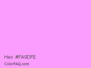 Hex #fa9dfe Color is a very light magenta color and the nearest color is Rich Brilliant Lavender #f1a7fe. Hex code #fa9dfe and RGB value is rgb(250,157,254). In RGB color space, this color is composed of 98% red, 62% green, 100% blue, In CMYK color space, this color is composed of 2% cyan, 38% magenta, 0% yellow , 0% black , In HSL color space, this color has a hue angle of 298° , 98% saturation and 81% lightness.