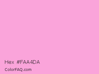 Hex #faa4da Color is a very light magenta color and the nearest color is Lavender Rose #fba0e3. Hex code #faa4da and RGB value is rgb(250,164,218). In RGB color space, this color is composed of 98% red, 64% green, 85% blue, In CMYK color space, this color is composed of 0% cyan, 34% magenta, 13% yellow , 2% black , In HSL color space, this color has a hue angle of 322° , 90% saturation and 81% lightness.