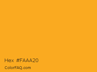 Hex #faaa20 Color is a normal orange color and the nearest color is Bright Yellow Crayola #ffaa1d. Hex code #faaa20 and RGB value is rgb(250,170,32). In RGB color space, this color is composed of 98% red, 67% green, 13% blue, In CMYK color space, this color is composed of 0% cyan, 32% magenta, 87% yellow , 2% black , In HSL color space, this color has a hue angle of 38° , 96% saturation and 55% lightness.