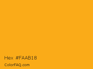 Hex #faab18 Color is a normal orange color and the nearest color is Sun #fbac13. Hex code #faab18 and RGB value is rgb(250,171,24). In RGB color space, this color is composed of 98% red, 67% green, 9% blue, In CMYK color space, this color is composed of 0% cyan, 32% magenta, 90% yellow , 2% black , In HSL color space, this color has a hue angle of 39° , 96% saturation and 54% lightness.