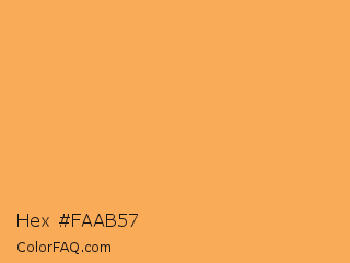 Hex #faab57 Color is a light orange color and the nearest color is Rajah #fbab60. Hex code #faab57 and RGB value is rgb(250,171,87). In RGB color space, this color is composed of 98% red, 67% green, 34% blue, In CMYK color space, this color is composed of 0% cyan, 32% magenta, 65% yellow , 2% black , In HSL color space, this color has a hue angle of 31° , 94% saturation and 66% lightness.