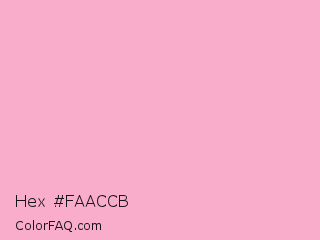 Hex #faaccb Color is a very light rose color and the nearest color is Nadeshiko Pink #f6adc6. Hex code #faaccb and RGB value is rgb(250,172,203). In RGB color space, this color is composed of 98% red, 67% green, 80% blue, In CMYK color space, this color is composed of 0% cyan, 31% magenta, 19% yellow , 2% black , In HSL color space, this color has a hue angle of 336° , 89% saturation and 83% lightness.