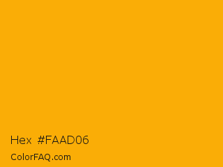 Hex #faad06 Color is a normal orange color and the nearest color is Yellow Sea #fea904. Hex code #faad06 and RGB value is rgb(250,173,6). In RGB color space, this color is composed of 98% red, 68% green, 2% blue, In CMYK color space, this color is composed of 0% cyan, 31% magenta, 98% yellow , 2% black , In HSL color space, this color has a hue angle of 41° , 96% saturation and 50% lightness.