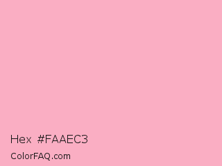 Hex #faaec3 Color is a very light rose color and the nearest color is Nadeshiko Pink #f6adc6. Hex code #faaec3 and RGB value is rgb(250,174,195). In RGB color space, this color is composed of 98% red, 68% green, 76% blue, In CMYK color space, this color is composed of 0% cyan, 30% magenta, 22% yellow , 2% black , In HSL color space, this color has a hue angle of 343° , 88% saturation and 83% lightness.