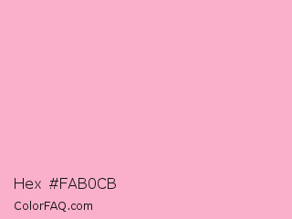 Hex #fab0cb Color is a very light rose color and the nearest color is Nadeshiko Pink #f6adc6. Hex code #fab0cb and RGB value is rgb(250,176,203). In RGB color space, this color is composed of 98% red, 69% green, 80% blue, In CMYK color space, this color is composed of 0% cyan, 30% magenta, 19% yellow , 2% black , In HSL color space, this color has a hue angle of 338° , 88% saturation and 84% lightness.