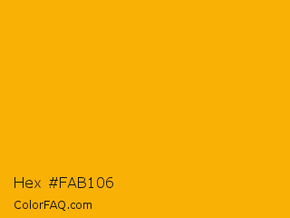 Hex #fab106 Color is a normal orange color and the nearest color is UCLA Gold #ffb300. Hex code #fab106 and RGB value is rgb(250,177,6). In RGB color space, this color is composed of 98% red, 69% green, 2% blue, In CMYK color space, this color is composed of 0% cyan, 29% magenta, 98% yellow , 2% black , In HSL color space, this color has a hue angle of 42° , 96% saturation and 50% lightness.