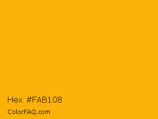 Hex #fab108 Color is a normal orange color and the nearest color is UCLA Gold #ffb300. Hex code #fab108 and RGB value is rgb(250,177,8). In RGB color space, this color is composed of 98% red, 69% green, 3% blue, In CMYK color space, this color is composed of 0% cyan, 29% magenta, 97% yellow , 2% black , In HSL color space, this color has a hue angle of 42° , 96% saturation and 51% lightness.