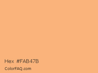Hex #fab47b Color is a light orange color and the nearest color is Mellow Apricot #f8b878. Hex code #fab47b and RGB value is rgb(250,180,123). In RGB color space, this color is composed of 98% red, 71% green, 48% blue, In CMYK color space, this color is composed of 0% cyan, 28% magenta, 51% yellow , 2% black , In HSL color space, this color has a hue angle of 27° , 93% saturation and 73% lightness.