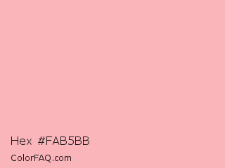 Hex #fab5bb Color is a very light red color and the nearest color is Light Pink #ffb6c1. Hex code #fab5bb and RGB value is rgb(250,181,187). In RGB color space, this color is composed of 98% red, 71% green, 73% blue, In CMYK color space, this color is composed of 0% cyan, 28% magenta, 25% yellow , 2% black , In HSL color space, this color has a hue angle of 355° , 87% saturation and 85% lightness.