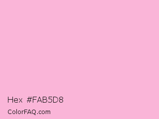 Hex #fab5d8 Color is a very light rose color and the nearest color is Cotton Candy #ffb7d5. Hex code #fab5d8 and RGB value is rgb(250,181,216). In RGB color space, this color is composed of 98% red, 71% green, 85% blue, In CMYK color space, this color is composed of 0% cyan, 28% magenta, 14% yellow , 2% black , In HSL color space, this color has a hue angle of 330° , 87% saturation and 85% lightness.