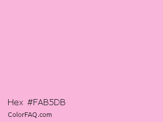 Hex #fab5db Color is a very light magenta color and the nearest color is Light Hot Pink #ffb3de. Hex code #fab5db and RGB value is rgb(250,181,219). In RGB color space, this color is composed of 98% red, 71% green, 86% blue, In CMYK color space, this color is composed of 0% cyan, 28% magenta, 12% yellow , 2% black , In HSL color space, this color has a hue angle of 327° , 87% saturation and 85% lightness.