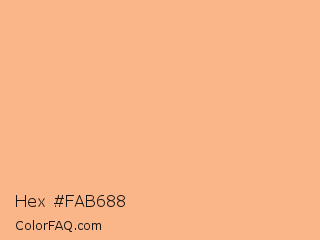 Hex #fab688 Color is a light orange color and the nearest color is Macaroni And Cheese #ffbd88. Hex code #fab688 and RGB value is rgb(250,182,136). In RGB color space, this color is composed of 98% red, 71% green, 53% blue, In CMYK color space, this color is composed of 0% cyan, 27% magenta, 46% yellow , 2% black , In HSL color space, this color has a hue angle of 24° , 92% saturation and 76% lightness.