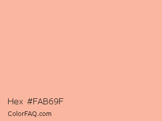 Hex #fab69f Color is a light color and the nearest color is Rose Bud #fbb2a3. Hex code #fab69f and RGB value is rgb(250,182,159). In RGB color space, this color is composed of 98% red, 71% green, 62% blue, In CMYK color space, this color is composed of 0% cyan, 27% magenta, 36% yellow , 2% black , In HSL color space, this color has a hue angle of 15° , 90% saturation and 80% lightness.