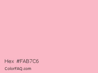 Hex #fab7c6 Color is a very light red color and the nearest color is Cherry Blossom Pink #ffb7c5. Hex code #fab7c6 and RGB value is rgb(250,183,198). In RGB color space, this color is composed of 98% red, 72% green, 78% blue, In CMYK color space, this color is composed of 0% cyan, 27% magenta, 21% yellow , 2% black , In HSL color space, this color has a hue angle of 347° , 87% saturation and 85% lightness.