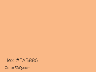 Hex #fab886 Color is a light orange color and the nearest color is Macaroni And Cheese #ffbd88. Hex code #fab886 and RGB value is rgb(250,184,134). In RGB color space, this color is composed of 98% red, 72% green, 53% blue, In CMYK color space, this color is composed of 0% cyan, 26% magenta, 46% yellow , 2% black , In HSL color space, this color has a hue angle of 26° , 92% saturation and 75% lightness.