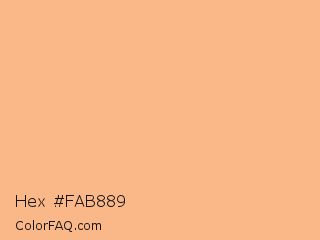 Hex #fab889 Color is a light orange color and the nearest color is Macaroni And Cheese #ffbd88. Hex code #fab889 and RGB value is rgb(250,184,137). In RGB color space, this color is composed of 98% red, 72% green, 54% blue, In CMYK color space, this color is composed of 0% cyan, 26% magenta, 45% yellow , 2% black , In HSL color space, this color has a hue angle of 25° , 92% saturation and 76% lightness.