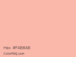 Hex #fab8ab Color is a very light red color and the nearest color is Melon Crayola #febaad. Hex code #fab8ab and RGB value is rgb(250,184,171). In RGB color space, this color is composed of 98% red, 72% green, 67% blue, In CMYK color space, this color is composed of 0% cyan, 26% magenta, 32% yellow , 2% black , In HSL color space, this color has a hue angle of 10° , 89% saturation and 83% lightness.