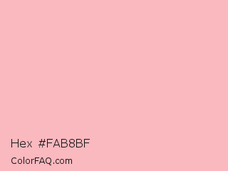 Hex #fab8bf Color is a very light red color and the nearest color is Light Pink #ffb6c1. Hex code #fab8bf and RGB value is rgb(250,184,191). In RGB color space, this color is composed of 98% red, 72% green, 75% blue, In CMYK color space, this color is composed of 0% cyan, 26% magenta, 24% yellow , 2% black , In HSL color space, this color has a hue angle of 354° , 87% saturation and 85% lightness.