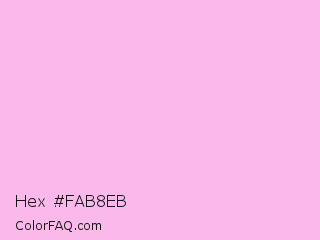 Hex #fab8eb Color is a very light magenta color and the nearest color is Light Hot Pink #ffb3de. Hex code #fab8eb and RGB value is rgb(250,184,235). In RGB color space, this color is composed of 98% red, 72% green, 92% blue, In CMYK color space, this color is composed of 0% cyan, 26% magenta, 6% yellow , 2% black , In HSL color space, this color has a hue angle of 314° , 87% saturation and 85% lightness.