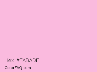 Hex #fabade Color is a very light magenta color and the nearest color is Cupid #fbbeda. Hex code #fabade and RGB value is rgb(250,186,222). In RGB color space, this color is composed of 98% red, 73% green, 87% blue, In CMYK color space, this color is composed of 0% cyan, 26% magenta, 11% yellow , 2% black , In HSL color space, this color has a hue angle of 326° , 86% saturation and 85% lightness.