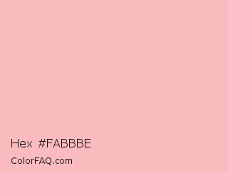 Hex #fabbbe Color is a very light red color and the nearest color is Spanish Pink #f7bfbe. Hex code #fabbbe and RGB value is rgb(250,187,190). In RGB color space, this color is composed of 98% red, 73% green, 75% blue, In CMYK color space, this color is composed of 0% cyan, 25% magenta, 24% yellow , 2% black , In HSL color space, this color has a hue angle of 357° , 86% saturation and 86% lightness.