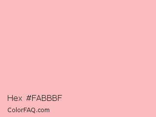 Hex #fabbbf Color is a very light red color and the nearest color is Spanish Pink #f7bfbe. Hex code #fabbbf and RGB value is rgb(250,187,191). In RGB color space, this color is composed of 98% red, 73% green, 75% blue, In CMYK color space, this color is composed of 0% cyan, 25% magenta, 24% yellow , 2% black , In HSL color space, this color has a hue angle of 356° , 86% saturation and 86% lightness.