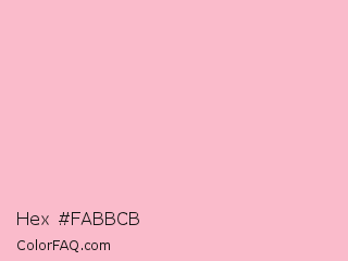 Hex #fabbcb Color is a very light red color and the nearest color is Pink #ffc0cb. Hex code #fabbcb and RGB value is rgb(250,187,203). In RGB color space, this color is composed of 98% red, 73% green, 80% blue, In CMYK color space, this color is composed of 0% cyan, 25% magenta, 19% yellow , 2% black , In HSL color space, this color has a hue angle of 345° , 86% saturation and 86% lightness.