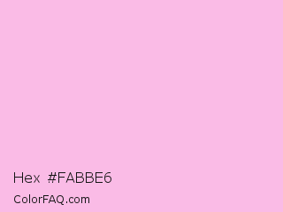 Hex #fabbe6 Color is a very light magenta color and the nearest color is Chantilly #f8c3df. Hex code #fabbe6 and RGB value is rgb(250,187,230). In RGB color space, this color is composed of 98% red, 73% green, 90% blue, In CMYK color space, this color is composed of 0% cyan, 25% magenta, 8% yellow , 2% black , In HSL color space, this color has a hue angle of 319° , 86% saturation and 86% lightness.